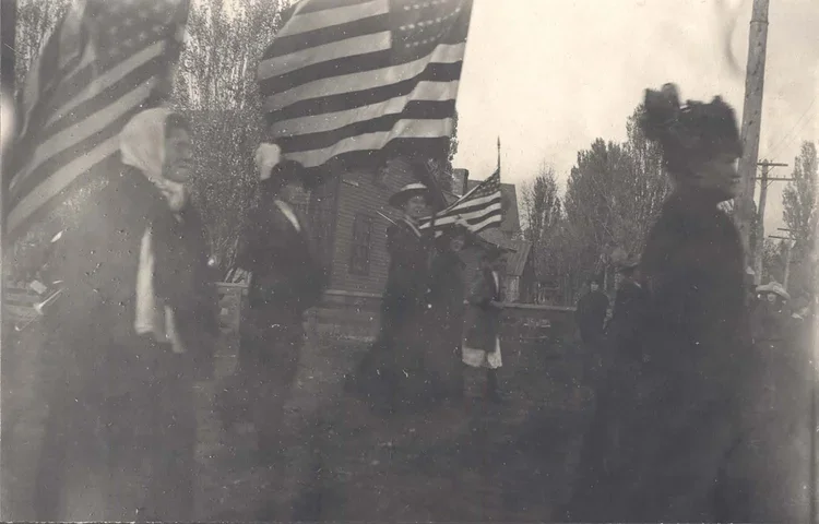 Image Credit: NPS, Keweenaw NHP, C&H, Capello, Strike Album, #163, [Anna Clemenc marching in strike parade with flag], 1913.